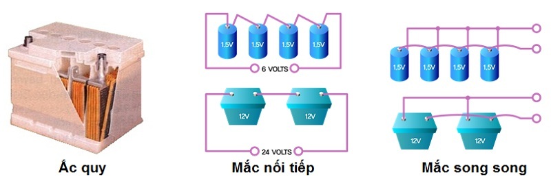 Trong xe thường sử dụng ắc quy điện 12V. Công suất ắc quy được biểu thị bằng đơn vị Ah (ampe-giờ). Một ắc quy có khả năng cấp một dòng điện ổn định trong 80h thì nó có công suất 80Ah. Công suất của ắc quy được đo trong những điều kiện cụ thể. Nếu 2 ắc quy 12V mắc nối tiếp thì nó cấp điện áp 24V, nếu 2 ắc quy mắc song song thì nó vẫn cấp một điện áp 12V nhưng công suất tăng lên.