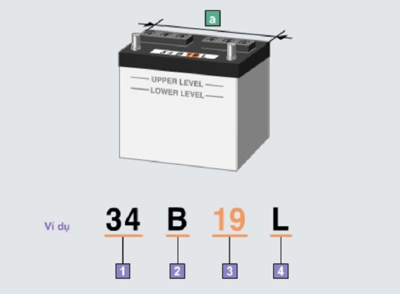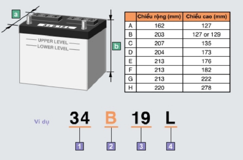 - Chiều rộng và chiều cao của ắc quy: Việc một thông số kết hợp chiều rộng và chiều cao của ắc quy được chỉ ra bằng một trong 8 chữ cái (Từ A đến H).Chữ cái càng gần với H, ắc quy sẽ rộng và cao hơn.