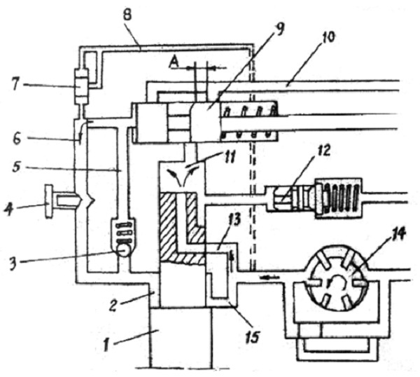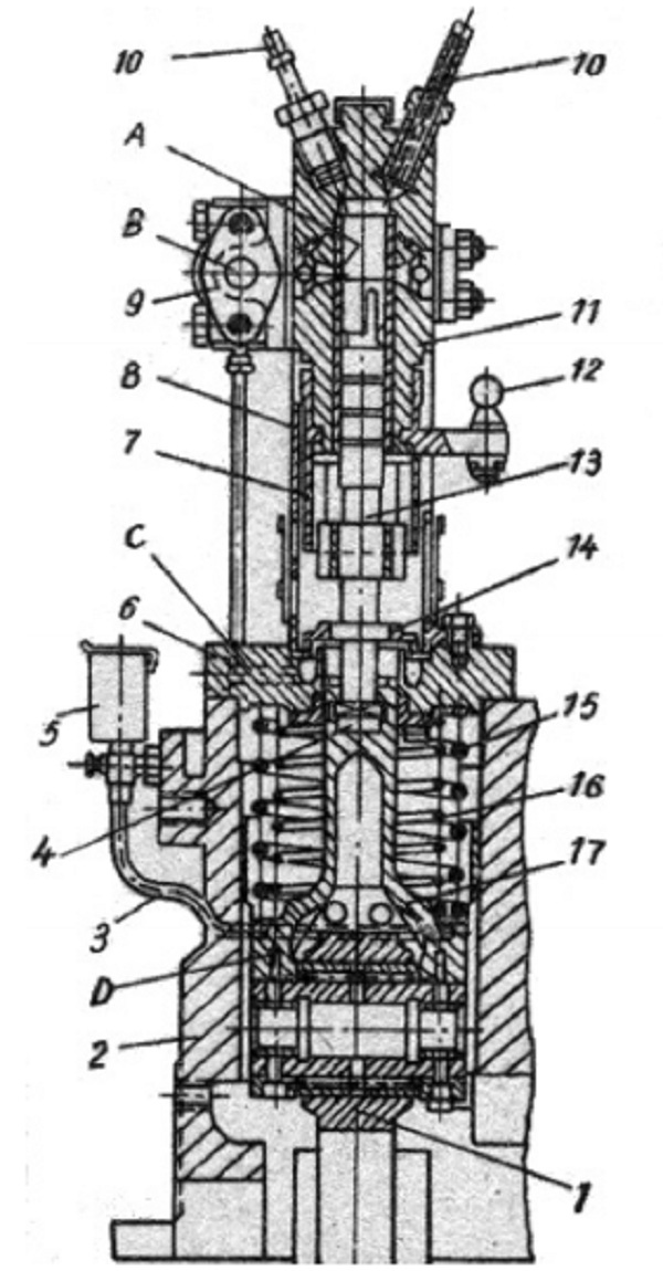 - Cơ cấu điều chỉnh lượng nhiên liệu cung cấp bằng vít có bước ren nhỏ cho mỗi nhánh bơm và tác dụng đến chiều cao của vòng răng 7 và xy lanh 6. Đầu hình trụ 2 của vít 4 lọt vào trong phần giữa của vòng răng 7 và xy lanh 6. Vị trí của vít 4 xác định vị trí của xy lanh 6 (theo chiều cao). Do có đường xiên của các răng ở vòng răng 7 và tay thước 8 cho nên khi xy lanh 6 chuyển địch lên trên hoặc xuống dưới sẽ làm cho piston 5 quay đi một ít và do đó làm thay đổi thời điểm kết thúc phun. Trên mỗi piston có một vít ren nhỏ cho phép điều chính một cách nhanh chóng và chính xác.