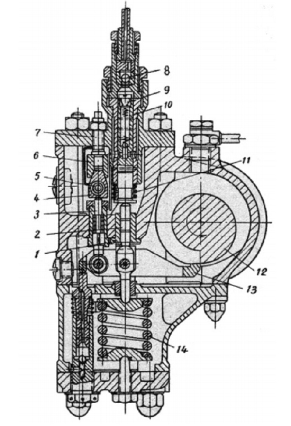 không tải; 11-Vít điều chỉnh; 12-Lò xo của bộ điều tốc; 13-Thanh nối.
