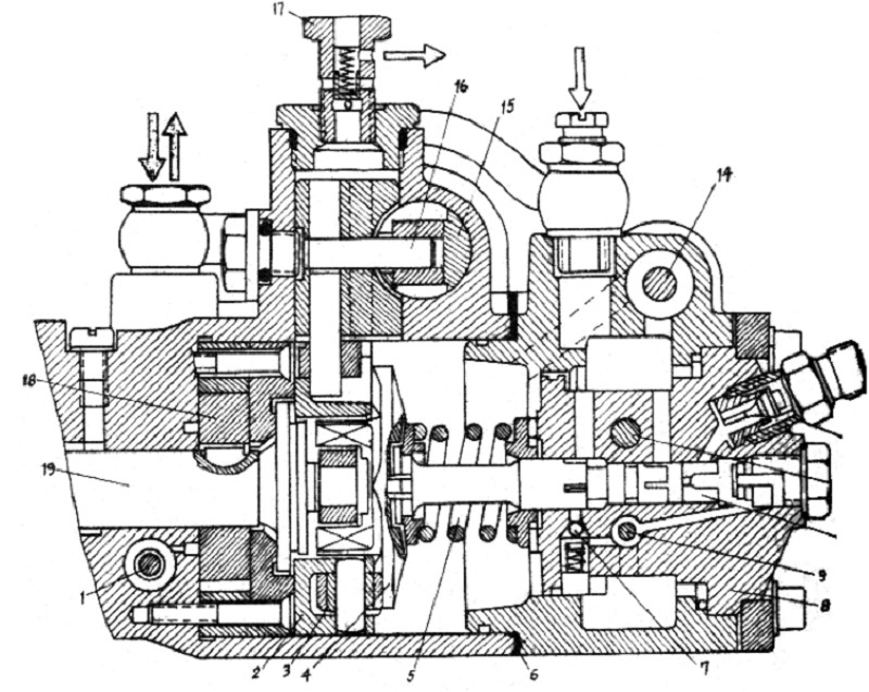 Nhiên liệu từ bơm chuyến qua bầu lọc tinh, ốc nối dẫn nhiên liệu vào lỗ A để vào khoang trên piston khi piston đi xuống. Lỗ phân phối T vào thởi điểm này không thông với các lỗ phân phối B, còn các lỗ cắt bị bộ phận định lượng 16 đóng lại. Sau khi đi qua điểm chết dưới, piston lại đi lên, nén nhiên liệu. Chuyến động qua lại tịnh tiến của piston được thực hiện bằng trục cam và lò xo 18 của con đội.