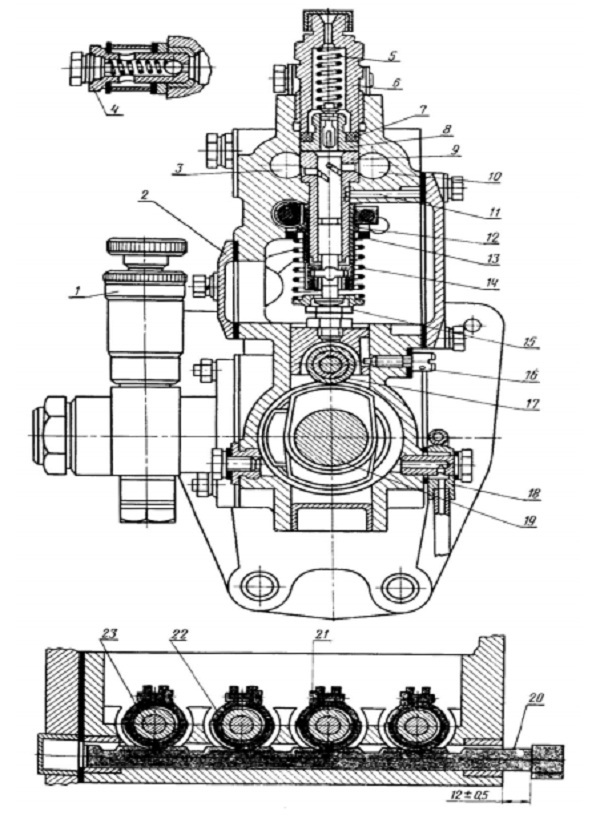 Trên đường ra từ rãnh cắt đặt một van cân bằng giữ cho áp suất cung cấp là 0.7 kg/cm2. Phía trên thân đặt một nắp để tháo lắp và điều chỉnh con đội của các nhánh bơm. Bơm chuyến nhiên liệu nhận truyền động từ cam lệch tâm của trục cam bơm. Thay đối lượng cung cấp nhiên liệu bằng cách xoay piston nhờ một vành răng. Con đội con lăn có bạc bơi, chúng được hãm cho khỏi xoay dọc trục nhờ vít văn vào thân bơm.