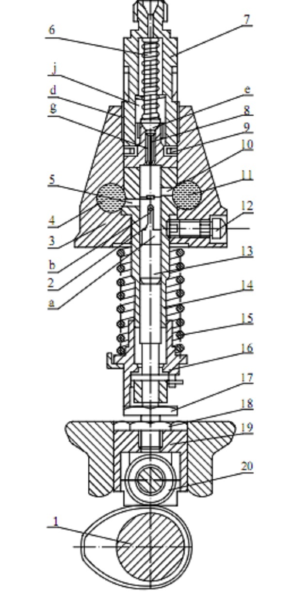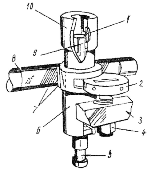 I-Ống hạn chế; 2-Con đội; 3-Chốt đấy; 4-Chêm điều chỉnh; 5-Thanh kéo; 6-Giá tỳ