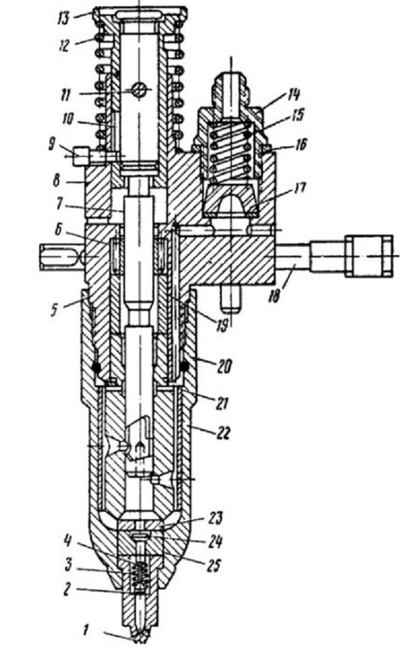 bơm và dung tích của đường ống rất nhỏ nên áp suất của nhiên liệu tác dụng lên van kim cũng giảm xuống đột ngột. Do chênh lệch áp suất nhiên liệu trong không gian dự trữ và trong đường ống cao áp nên van kim bật mở và nhiên liệu được phun vào xy lanh động cơ. Quá trình phun kết thúc vào lúc áp suất của nhiên liệu trong không gian dự trữ tác dụng lên van kim tạo ra một lực đẩy bằng lực ép ban đầu của lỏ xo 17 ép lên van kim.
