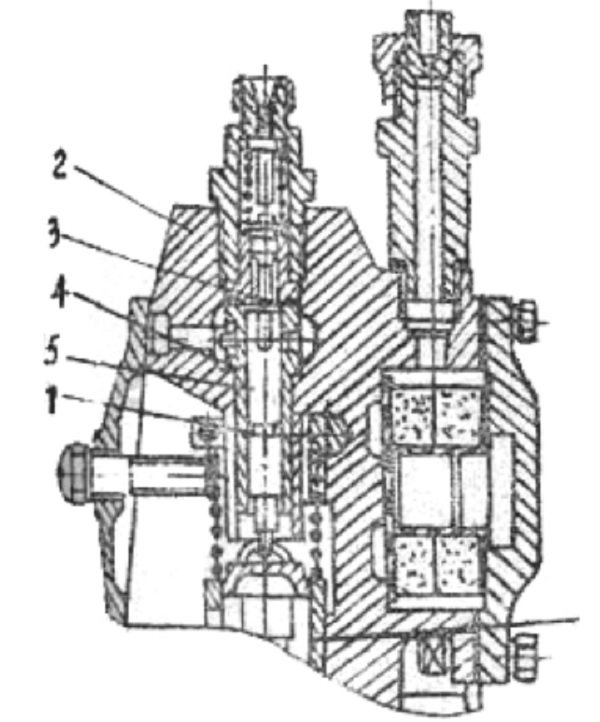 1-Bơm chuyến nhiên liệu; 2-Nắp; 3-Khoang xá; 4-Van cân bằng; 5-Lò xo van cao áp;