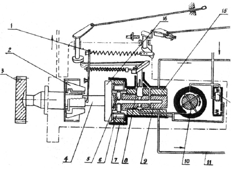Cam; 13-Tay đòn; 14-Lỏ xo công tác.