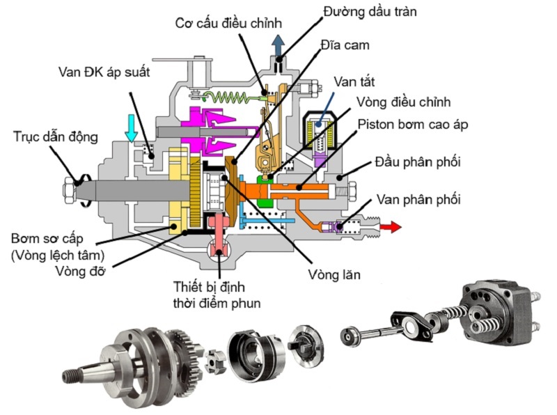Trục dẫn động bơm cao áp dẫn động bơm sơ cấp nhiên liệu là bơm cánh gạt để cấp nhiên liệu vào trong bơm. Chuyển động quay của trục dẫn động bơm cao áp biến thành chuyển động tịnh tiến qua lại của piston bơm cao áp thông qua đĩa cam và vòng lăn. Piston chuyển động bên trong xi lanh bơm cao áp nằm ở đầu phân phối được gắn vào bơm cao áp bằng bu lông. Cơ cấu điều chỉnh định vị vị trí của vòng điều chỉnh trên piston bơm cao áp. Cơ cấu điều chỉnh nằm ở phía trên của thân bơm có lò xo được nối với cần điều khiển bên ngoài. Cần điều khiển được nối với chân ga. Cơ cấu định thời điểm phun được lắp bên dưới bơm cao áp và vuông góc với trục của bơm. Sự hoạt động của cơ cấu định thời điểm phun được quyết định bới áp suất nhiên liệu do bơm sơ cấp (Cánh gạt) và van điều chỉnh.