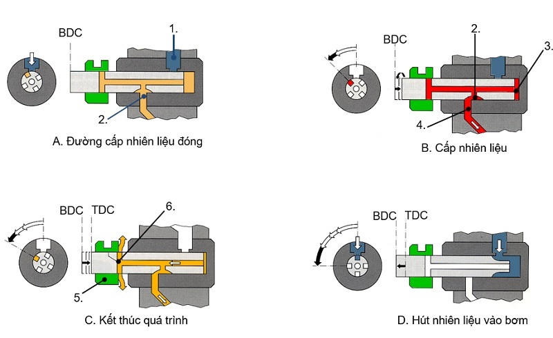 Nhiên liệu được bơm từ bơm cao áp để cấp cho các vòi phun được hoạt động gồm nhiều giai đoạn khác nhau. Mỗi chu kỳ hoạt động của piston (chuyển động qua lại một lần) sẽ cung cấp nhiên liệu cho một xi lanh. Với động cơ 4 kỳ, 4 xi lanh, piston chuyển động từ BDC đến TDC và ngược lại đồng thời quay một góc 900 sẽ kết thúc một chu kỳ cấp nhiên liệu cho 1 xi lanh.