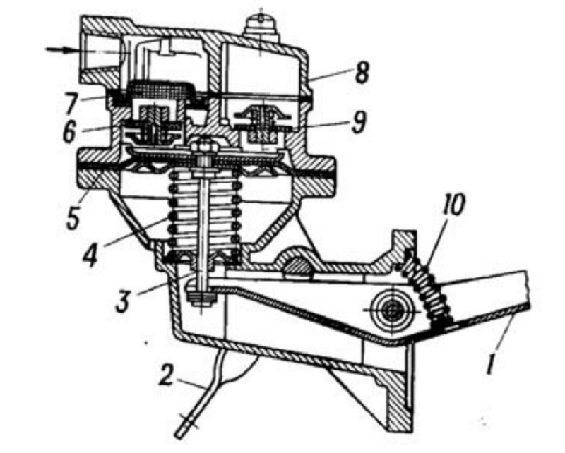 Khi bánh lệch tâm của trục phân phối tác động lên đầu ngoài của đòn bẫy 1 của bơm, màng 5 của thanh 3 kéo xuống phía đưới. Ở khoang phía trên màng tạo ra giảm áp;
