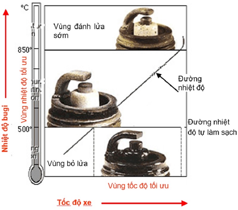 Nhiệt độ làm việc của bugi: Nhiệt độ làm việc tối ưu của bugi nằm trong khoảng từ 5000C đến 8500C. Nếu nhiệt độ thấp hơn 5000C thì có hiện tượng bỏ lửa và bề mặt bugi có muội than. Nếu nhiệt độ lớn hơn 8500C thì có hiện tượng đánh lửa sớm, không tốt cho động cơ và hiệt suất máy không cao