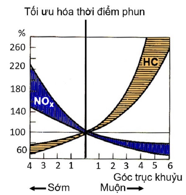 Phun muộn sẽ giảm các chất khí độc hại CO và NOx nhưng nếu muộn quá sẽ làm tăng các chất HC. Chỉ cần thời điểm phun bị lệch đi 10 cũng làm tăng lượng CO và NOx lên 15%. Do đó, việc xác định chính xác thời điểm phun là rất quan trọng và trong các động cơ hiện đại, việc xác định thời điểm phun được tính toán và quyết định bằng mô đun điều khiển điện tử (ECM) dựa trên rất nhiều thông tin đầu vào.