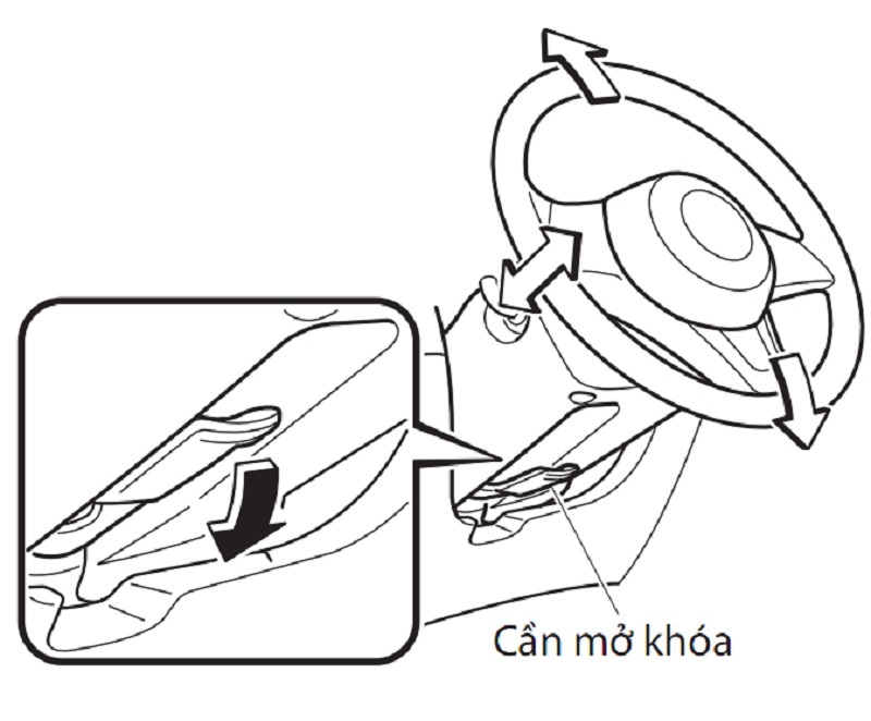 Để thay đổi góc nghiêng và chiều dài của vô lăng: