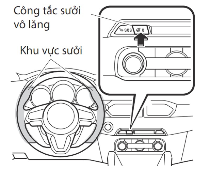 Nhấn vào công tắc sưởi vô lăng Chế độ sưởi sẽ hoạt động trong khoảng 30p và sau đó sẽ tự động tắt.