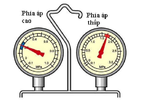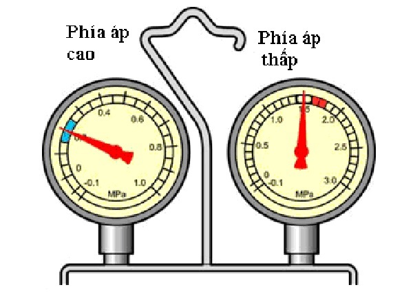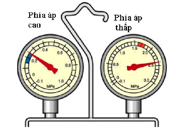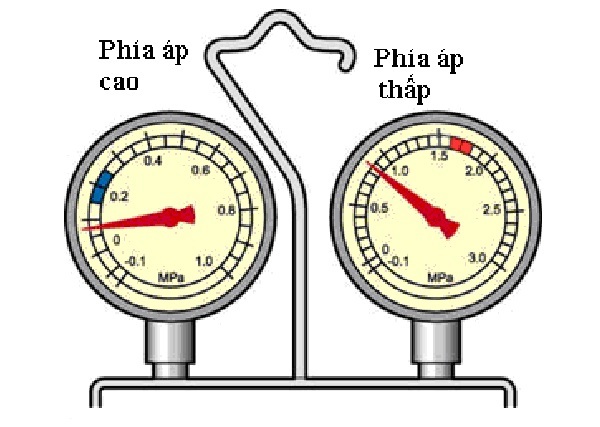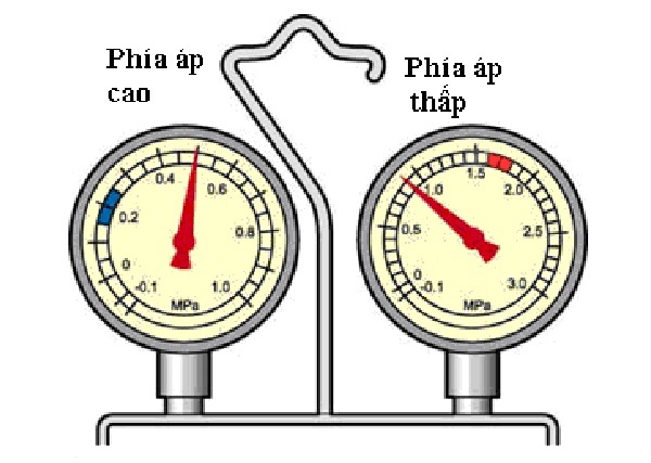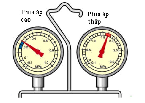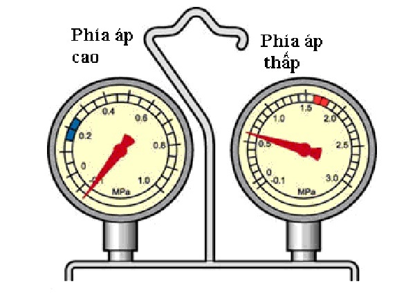Trên hình vẽ: Nếu thiếu môi chất, giá trị áp suất trên đồng hồ ở cả hai vùng áp cao và áp thấp đều nhỏ hơn giá trị bình thường.