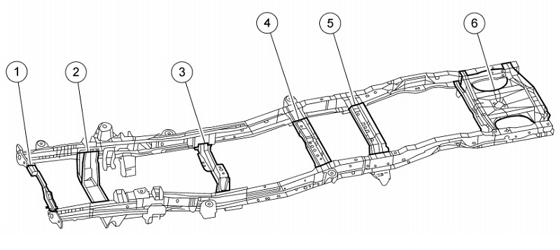 • Các thanh dầm ngang số 1A (chỉ cho loại 4 bánh dẫn động (4WD)) và thanh số 1 được hàn với khung thép dọc.