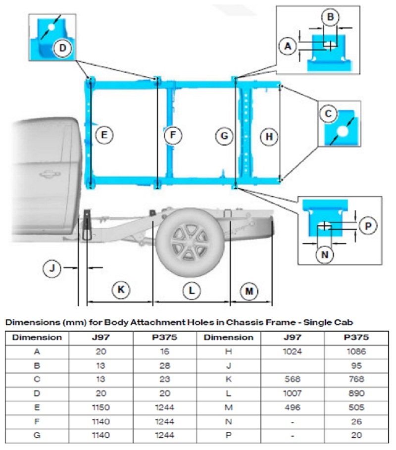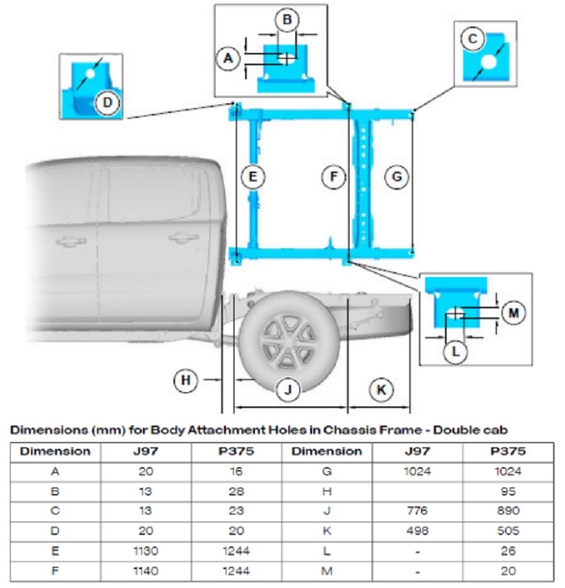 Các kích thước (mm) cho các lỗ lắp thân xe ở khung sườn trên mặt bích cơ sở trung bình |
