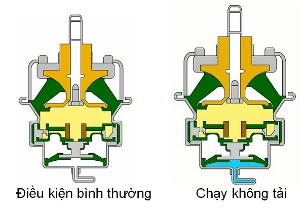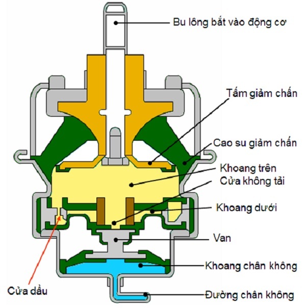 Chân máy điều khiển điện tử bao gồm chân máy, mô đun điều khiển, van điện từ và đường ống chân không. Trong điều kiện chạy bình thường, dưới tác động của lò xo, van đóng, dầu chỉ đi qua lỗ dầu do đó lưu lượng dòng bị hạn chế, chấn máy sẽ “cứng” hơn. Khi chạy không tải, ECM điều khiển van điện tử mở, áp suất chân không hút mở van, dầu sẽ đi qua cả lỗ dầu và lỗ không tải khiến chân máy “mềm” hơn.