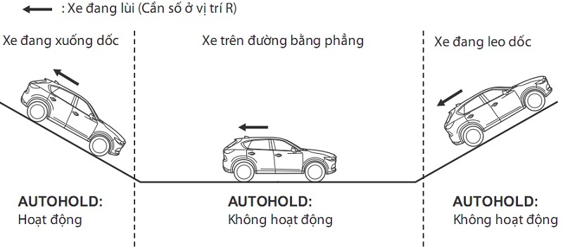 Chức năng AUTOHOLD có thể không hoạt động để duy trì trạng thái đứng yên của xe trong trường hợp xe đang dừng trên dốc, việc nhả bàn đạp phanh là rất nguy hiểm và có thể dẫn đên tai nạn nghiêm trong trường hợp xe bất ngờ di chuyển.