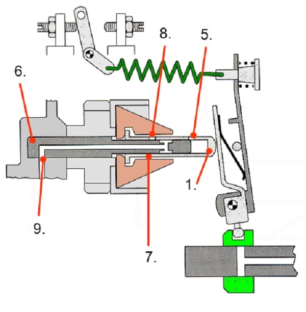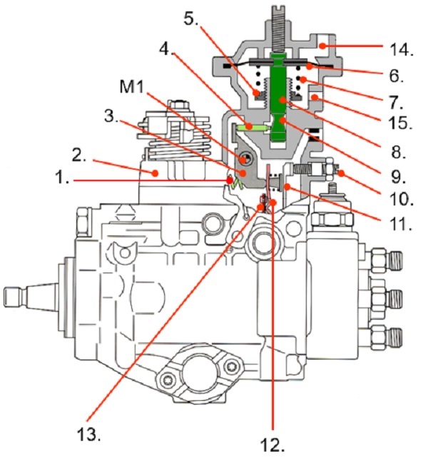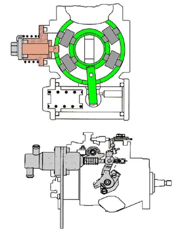 Cơ cấu bù áp phụ thuộc tải động cơ được thiết kế sao cho với chân ga không đổi, khi tải động cơ xuống, thời điểm phun chuyển sang muộn, khi tải động cơ tăng, thời điểm phun chuyển sang sớm. Cơ cấu được thiết kế như hình vẽ. Khi chân ga đạp về phía đầy tải, khi tốc độ động cơ tăng mà thực sực tải động cơ nhỏ hơn chế độ đầy tải, tốc độ động cơ sẽ tiếp tục tăng, theo chế độ điều khiển thông thường, lượng nhiên liệu sẽ được giảm xuống do cơ cấu điều khiển. Mặc khác, khi ống trượt 1 bị đẩy sang bên phải đến một mức độ nào đó, lỗ số 8 trên ống trượt sẽ thông với đường 9 nằm trong trục của cơ cấu điều khiển, đường số 9 lại được thông ra khoang hút của bơm cánh gạt, do đó, một phần nhiên liệu trong bơm lại được hồi lại cửa hút làm cho áp suất trong bơm giảm xuống. Áp suất nhiên liệu trong bơm giảm xuống sẽ dẫn đến cơ cấu điều khiển thời điểm phun sẽ chuyển sang phun muộn. Ngược lại, nếu tải động cơ tăng mà chân ga không thay đổi, tốc độ động cơ giảm, ống trượt sẽ di chuyển sang trái và lỗ 8 sẽ đóng lại. Áp suất nhiên liệu trong bơm tăng lên và cơ cấu điều khiển thời điểm phun sẽ chuyển sang sớm.
