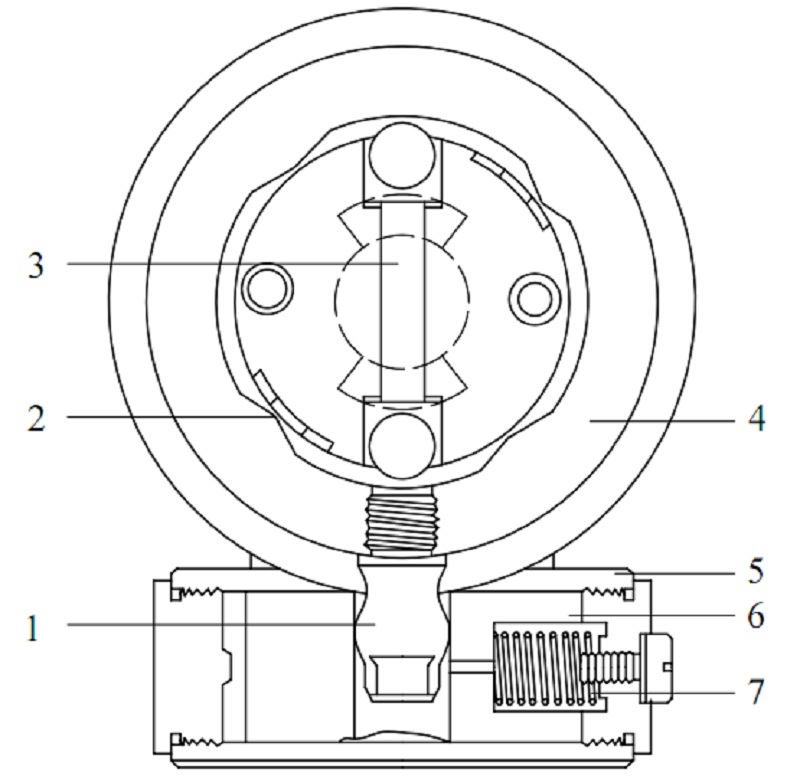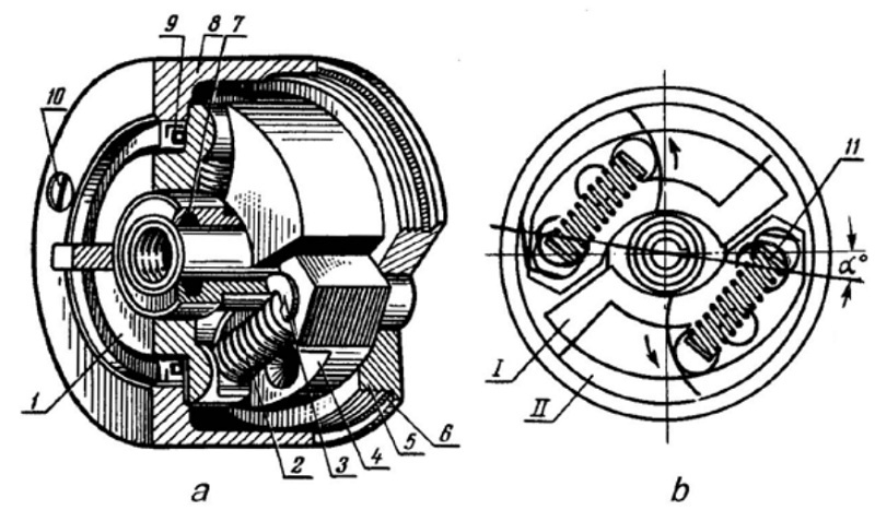 1-Đầu quả táo; 2-Cam; 3-Piston; 4-Vòng cam; 5-Thân bộ phận điều chỉnh; 6-Piston;