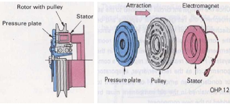 Khi động cơ hoạt động, puly quay theo do nó được nối với trục khuỷu nhờ dây đai dẫn động, nhưng lốc điều hòa chưa hoạt động do ly hợp từ chưa đóng. Khi bật công tắc hệ thống điều hòa không khí, bộ điều khiển cấp dòng cho stato. Lực điện từ sẽ hút đĩa ép và kéo đĩa ép ép lên bề mặt ma sát của puly.