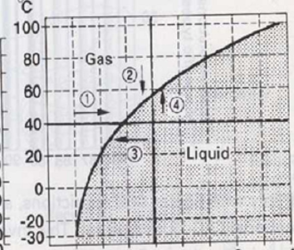 Đồ thị mô tả mối liên hệ giữa áp suất và nhiệt độ . Đồ thị chỉ ra điểm sôi của R-134a ở mỗi cặp giá trị nhiệt độ và áp suất. Phần diện tích trên đường cong áp suất biểu diễn R-134a ở trạng thái khí và phần diện tích dưới đường cong áp suất biểu diễn R-134a ở trạng thái lỏng. Ga lạnh thể khí có thể chuyển sang thể lỏng chỉ bằng cách tăng áp suất mà không cần thay đổi nhiệt độ hoặc giảm nhiệt độ mà không cần thay đổi áp suất.