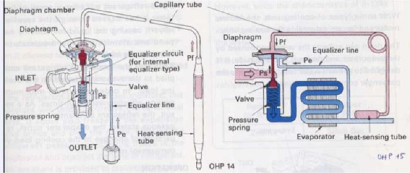 Lượng ga đi vào van giãn nở sau khi đã được hóa lỏng trong giàn nóng được quyết định bởi dịch chuyển của chuyển động thẳng đứng của van, phụ thuộc vào sự chênh lệch giữa áp suất bay hơi Pf bên trong ống cảm biến nhiệt và tổng của áp suất Ps và Pe, trong đó Ps là áp suất giữ tạo bởi lò xo nén và Pe là áp suất bay hơi bên trong giàn lạnh.