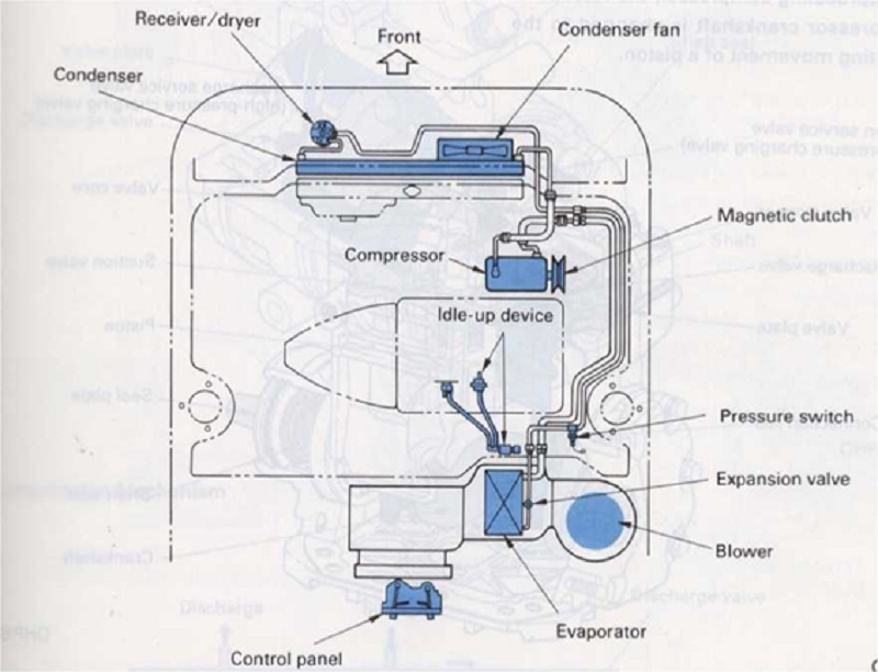 Cụm làm mát bao gồm: Giàn lạnh, môtơ quạt và quạt, van giãn nở được lắp bên trong khoang hành khách.