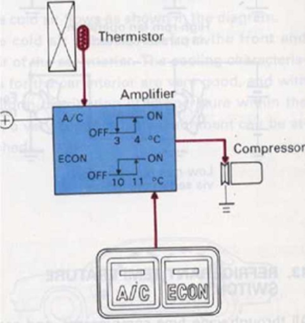 Một nhiệt điện trở gắn vào cánh của giàn lạnh, các tính hiệu từ nhiệt điện trở được sử dụng để điều khiển nhiệt độ giàn lạnh. Khi nhiệt độ cánh giảm, ly hợp từ sẽ tắt làm dừng lốc điều hòa.