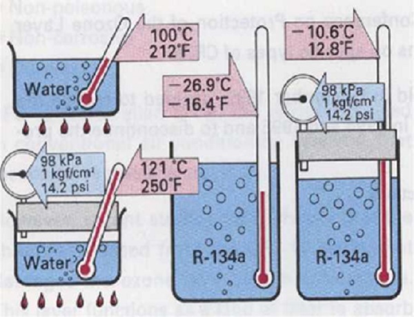 Nước sôi ở 1000C dưới áp suất khí quyển (1210C ở áp suất 1kgf/cm2) nhưng R-134a sôi ở -26,90C dưới áp suất này ( -10,60C ở áp suất 1kgf/cm2).