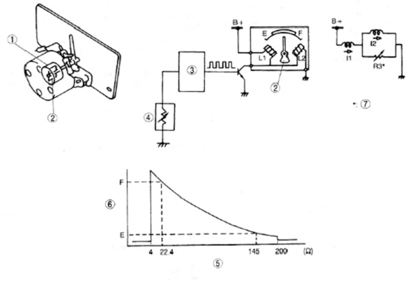 • Khi mức nhiên liệu trong thùng giảm xuống, dòng điện I1 chạy qua L1 giảm (từ trường của cuộn L1 giảm) và dòng điện I2 chạy qua L2 sẽ tăng (từ trường của cuộn L2 tăng) bởi vì tín hiệu ra từ bộ vi sử lý (tín hiệu dạng chu kỳ điều khiển) giảm xuống. Vì vậy mà từ lực sẽ làm cho kim của đồng hồ chuyển động theo chiều có chữ E.