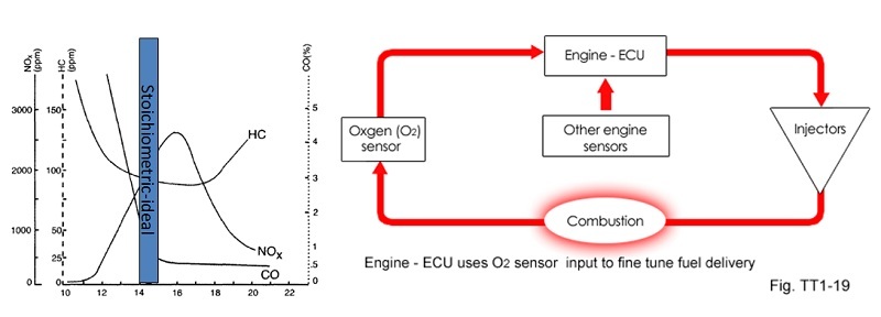 Như đã đề cập ở trên, bộ chuyển đổi xúc tác chuyển đổi các chất khí độc hại (NOX,CO, HC) thành các chất khí không độc hại (CO2, H2O). Để bộ chuyển đổi xúc tác hoạt động hiệu quả nhất thì phải duy trì tỉ lệ lamda =1. Khi đó lượng NOX,CO và HC vừa đủ để oxy hóa khử lẫn nhau để tạo thành CO2, H2O và lượng ô xi còn lại trong khí thải là thấp nhất. Dựa vào đặc tính này, phía sau bộ chuyển đổi xúc tác được lắp thêm cảm biến ô xy. Cảm biến ô xy sẽ cảm bến lượng ô xy còn lại trong khí thải và cấp thông tin cho ECM, ECM sẽ điều chỉnh lại tỉ lệ lamda sao cho lượng ô xy có trong khí thải là thấp nhất. Điều khiển theo hình thức này gọi là điều khiển vòng kín.
