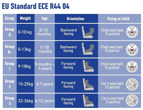 Bảng hướng dẫn sử dụng ghế an toàn cho bé theo tiêu chuẩn Châu Âu: