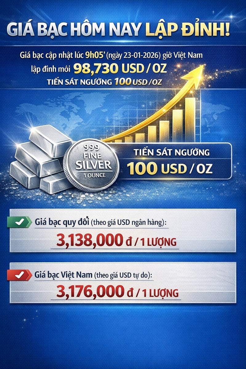 Giá bạc cập nhật lúc 9h05' (ngày 23-01-2026) giờ Việt Nam lập đỉnh mới 98,730 usd/oz. Tiến sát ngưỡng 100 usd/oz