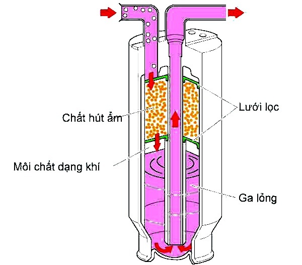 - Bộ sấy (bộ lọc): Là một thiết bị để chứa môi chất được hoá lỏng tạm thời bởi giàn nóng và cung cấp một lượng môi chất theo yêu cầu tới giàn lạnh. Bộ sấy có chất hút ẩm và lưới lọc dùng để loại trừ các tạp chất hoặc hơi ẩm trong chu trình làm lạnh. Nếu có hơi ẩm trong chu trình làm lạnh, thì các chi tiết sẽ bị mài mòn hoặc đóng băng ở van giãn nở dẫn đến bị nghẹt.