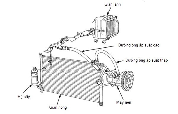 - Lốc điều hòa (Compressor), giàn nóng (Condenser), bộ sấy (Receiver/ Dryer), giàn lạnh (Evaporator), đường ống áp suất cao (Suction line), đường ống áp suất thấp (Discharge line).