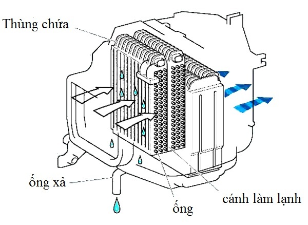 - Giàn lạnh: Giàn lạnh làm bay hơi môi chất ở dạng sương sau khi qua van giãn nở. Môi chất trong giàn lạnh có nhiệt độ và áp suất thấp, nó làm lạnh không khí ở xung quanh giàn lạnh.