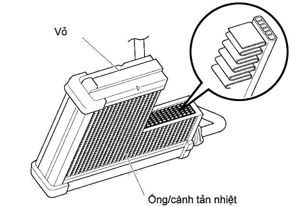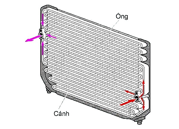 - Bộ ngưng tụ (giàn nóng): Làm mát môi chất ở thể khí có áp suất và nhiệt độ cao bị nén bởi Lốc điều hòa và chuyển nó thành môi chất ở trạng thái nhiệt độ và áp suất thấp (phần lớn môi chất ở trạng thái lỏng và có lẫn một số ở trạng thái khí)