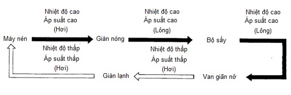 Khi hệ thống được bật, lốc điều hoà nén khí làm lạnh, tăng nhiệt độ và áp suất của nó. Sau đó chảy vào dàn nóng và ngưng tụ thành chất lỏng có nhiệt độ và áp suất cao. Chất làm lạnh lỏng sau đó chảy vào dàn lạnh. Chất làm lạnh bây giờ đã chuyển sang trạng thái hơi làm mát dàn lạnh, quạt thổi không khí lạnh ra ngoài và chất làm lạnh chảy trở lại máy nén để bắt đầu chu kỳ mới. Van tiết lưu điều chỉnh dòng chất làm lạnh để duy trì nhiệt độ mong muốn. Toàn bộ quá trình được điều khiển bởi các cảm biến và bộ điều khiển để đảm bảo hoạt động hiệu quả và tối ưu.