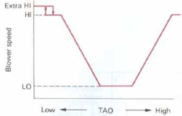 Khi công tắc AUTO bật, bộ khuếch đại điều hòa không khí tự động sẽ điều khiển tốc độ quạt thổi theo giá trị hiện thời của TAO theo đồ thị: