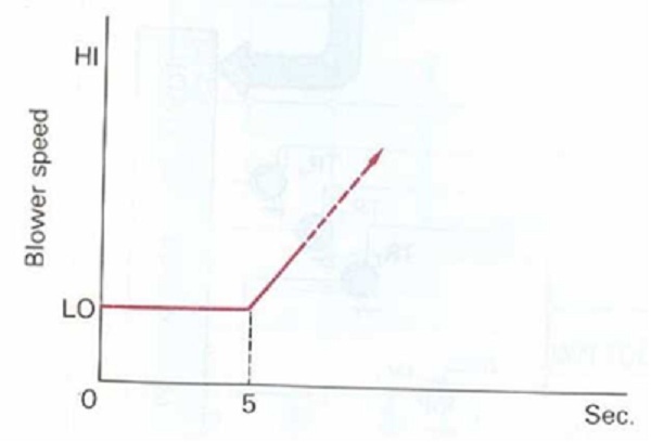 Sau thời gian 5s, hệ thống bật quạt thổi tại tốc độ thấp L0 để thổi khí mát trong bộ làm mát vào khoang hành khách.