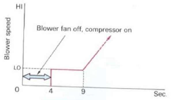 Chức năng điều khiển dòng khí trễ sẽ tắt môtơ quạt thổi khí và để nó tắt trong thời gian 4 giây khi lốc điều hòa chạy, làm mát không khí bên trong bộ làm mát.