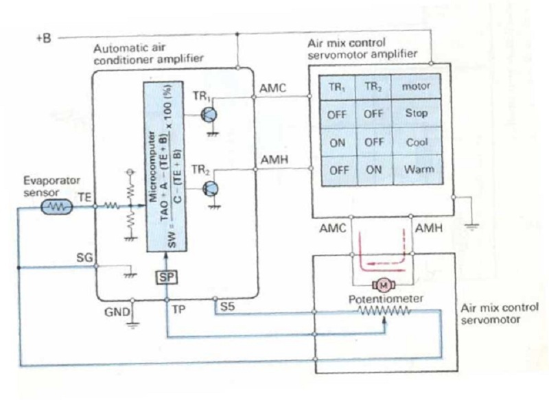 SW nhỏ hơn SP khi TAO nhỏ hơn TE. Lúc này bộ vi xử lý lắp trong bộ khuếch đại điều hòa không khí tự động sẽ bật TR1, tắt TR2, cho phép bộ khuếch đại của môtơ servo điều khiển hòa trộn khí cấp dòng điện đến môtơ servo điều khiển hòa trộn khí, do đó làm môtơ quay sang phía COOL, dịch chuyển cánh điều khiển hòa trộn khí để hạ thấp nhiệt độ khí thổi.
