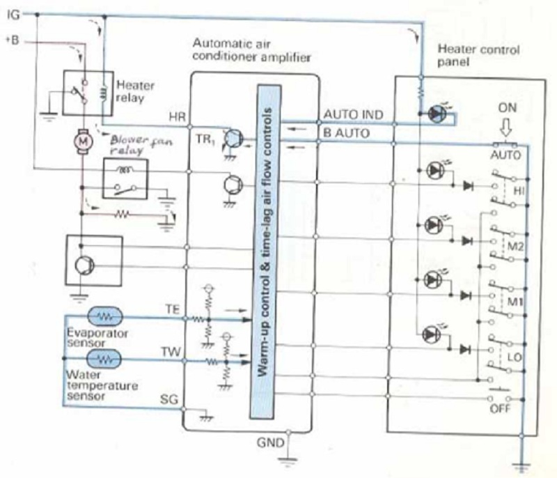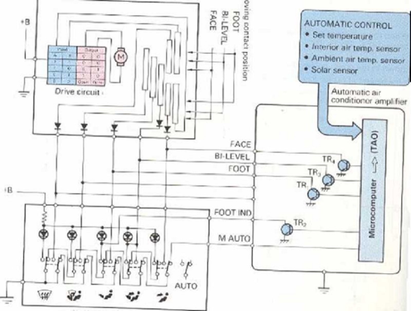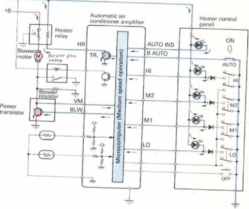 - Công tắt điều tốc độ quạt thổi:Bộ khuếch đại điều hòa không khí tự động, điện trở quạt thổi, transistor nguồn.