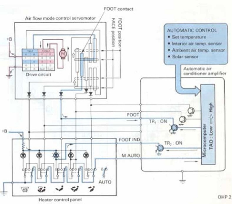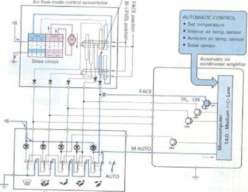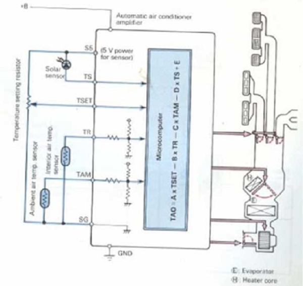 Từ thông số TAO này, điều hòa không khí tự động điều khiển bằng bộ vi xử lý gửi các tín hiệu dẫn động phát ra từ bộ khuếch đại đến các môtơservo và quạt thổi.