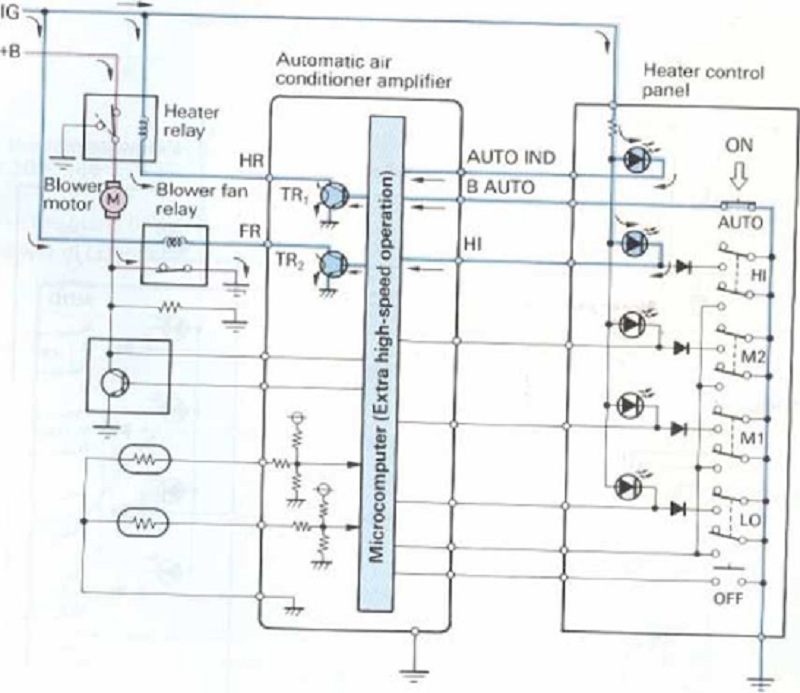Bộ vi xử lý bật TR1 và TR2 để kích hoạt rơle bộ sưởi và rơle quạt. Vì vậy, dòng điện chạy từ Ắc quy đến rơle bộ sưởi, sau đó đến môtơ quạt, đến rơle quạt và nối đất, làm cho môtơ quạt thổi chạy tại một tốc độ đặt biệt cao.