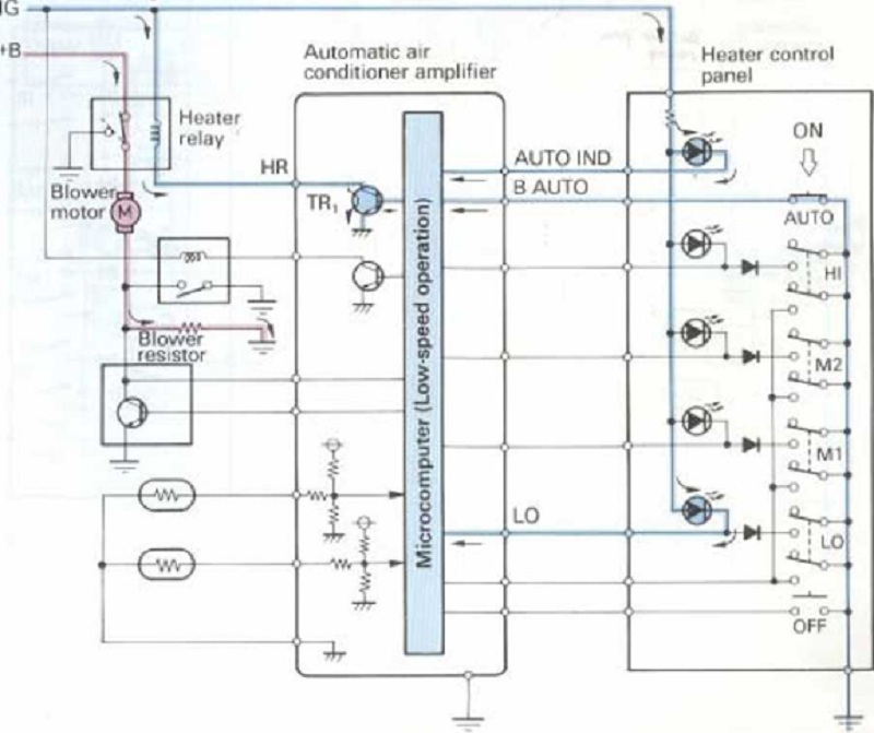 Khi công tắc AUTO bật, bộ vi xử lý sẽ bật TR1 để kích hoạt rơle sưởi, cho phép dòng điện chạy từ ắc quy đến rơle sưởi, sau đó đến môtơ quạt đến điện trở quạt và nối đất, do vậy mô tơ quạt chạy ở tốc độ thấp.