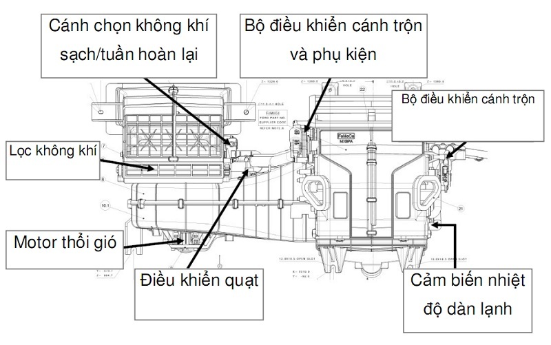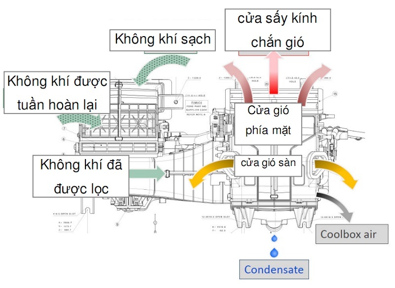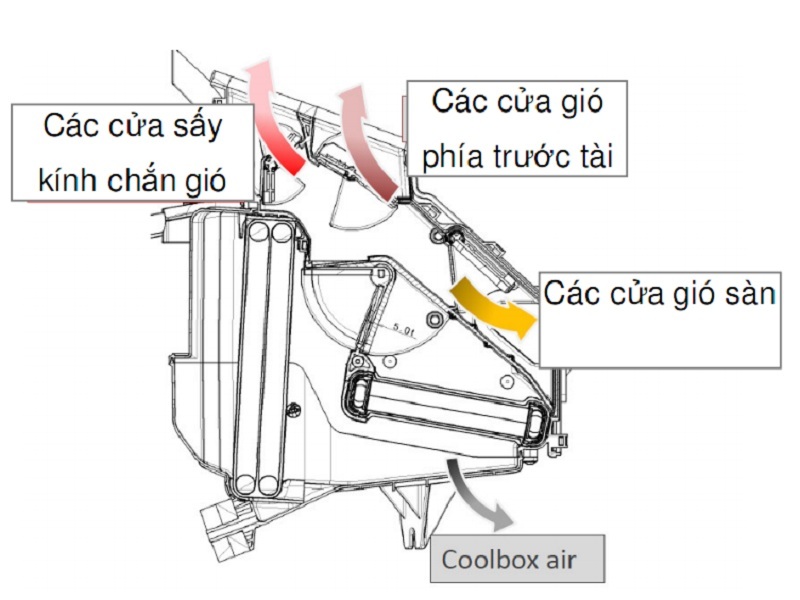 Từ cụm phân phối không khí (heater box), không khí trong cabin được phân phối thông qua nhiều cửa