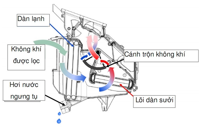 Để có không khí nóng, motor điều khiển cánh trộn sao cho toàn bộ không khí đi qua lõi dàn sưởi trước khi đi vào cabin xe.