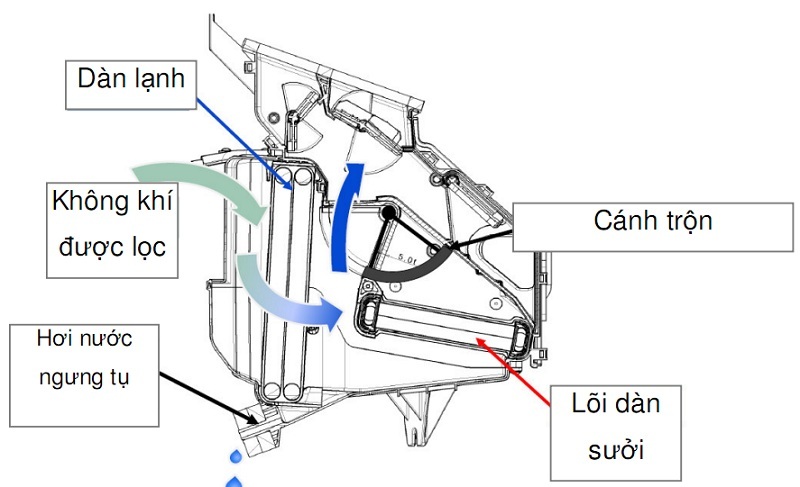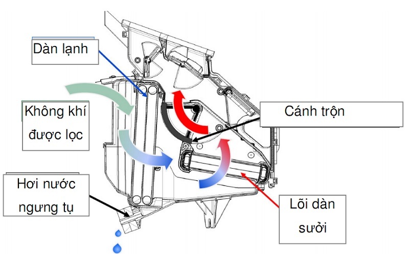 Đối với chế độ không khí lạnh, Để lấy không khí lạnh cung cấp cho cabin xe, motor chấp hành sẽ điều khiển cánh trộn không khí để khóa đường hơi nóng đi ra từ lõi dàn nóng.Tấm trộn này che lõi dàn nóng lại và chỉ cho không khí lạnh thổi vào cabin. Khi không khí được làm lạnh bằng dàn lạnh hơi ẩm được ngưng tụ thành nước và sẽ chảy ra bên ngoài xe.